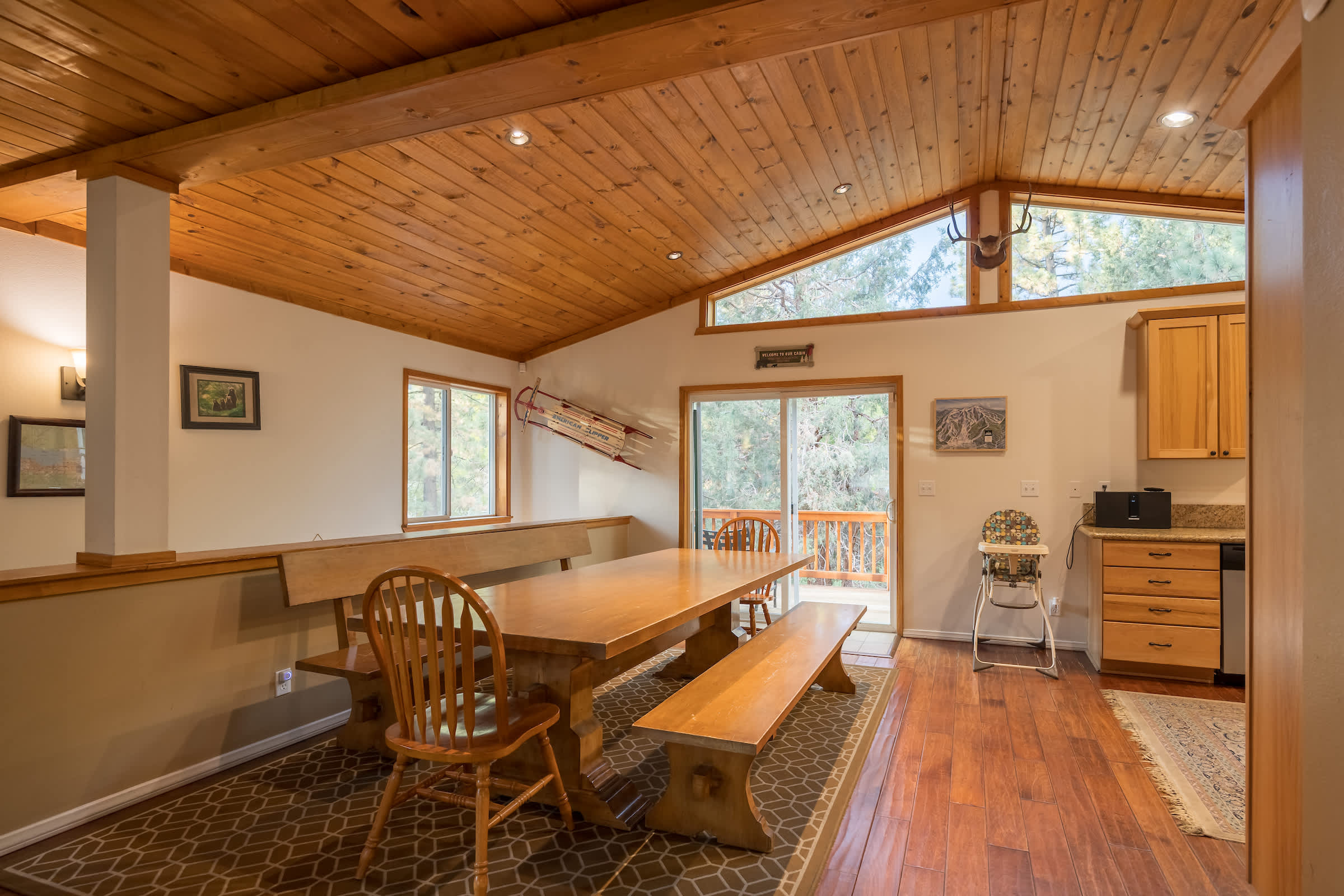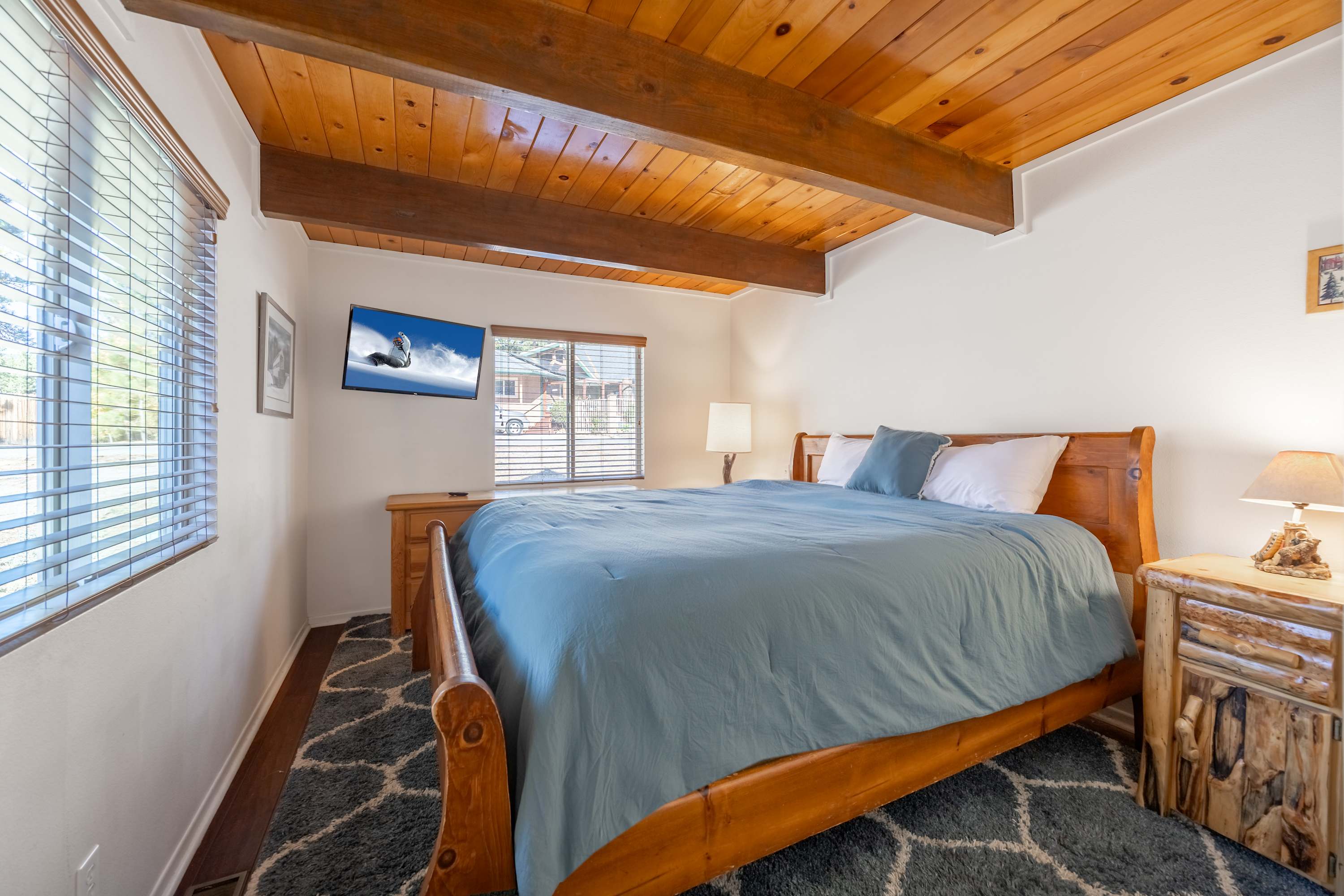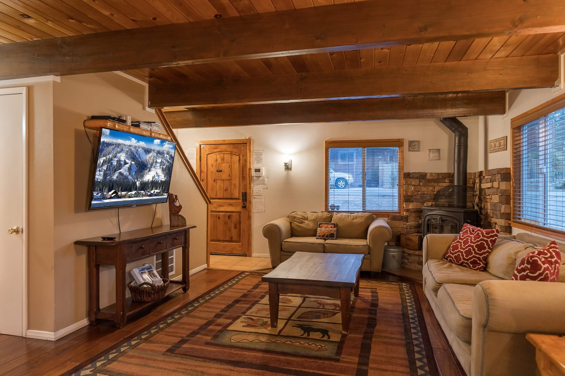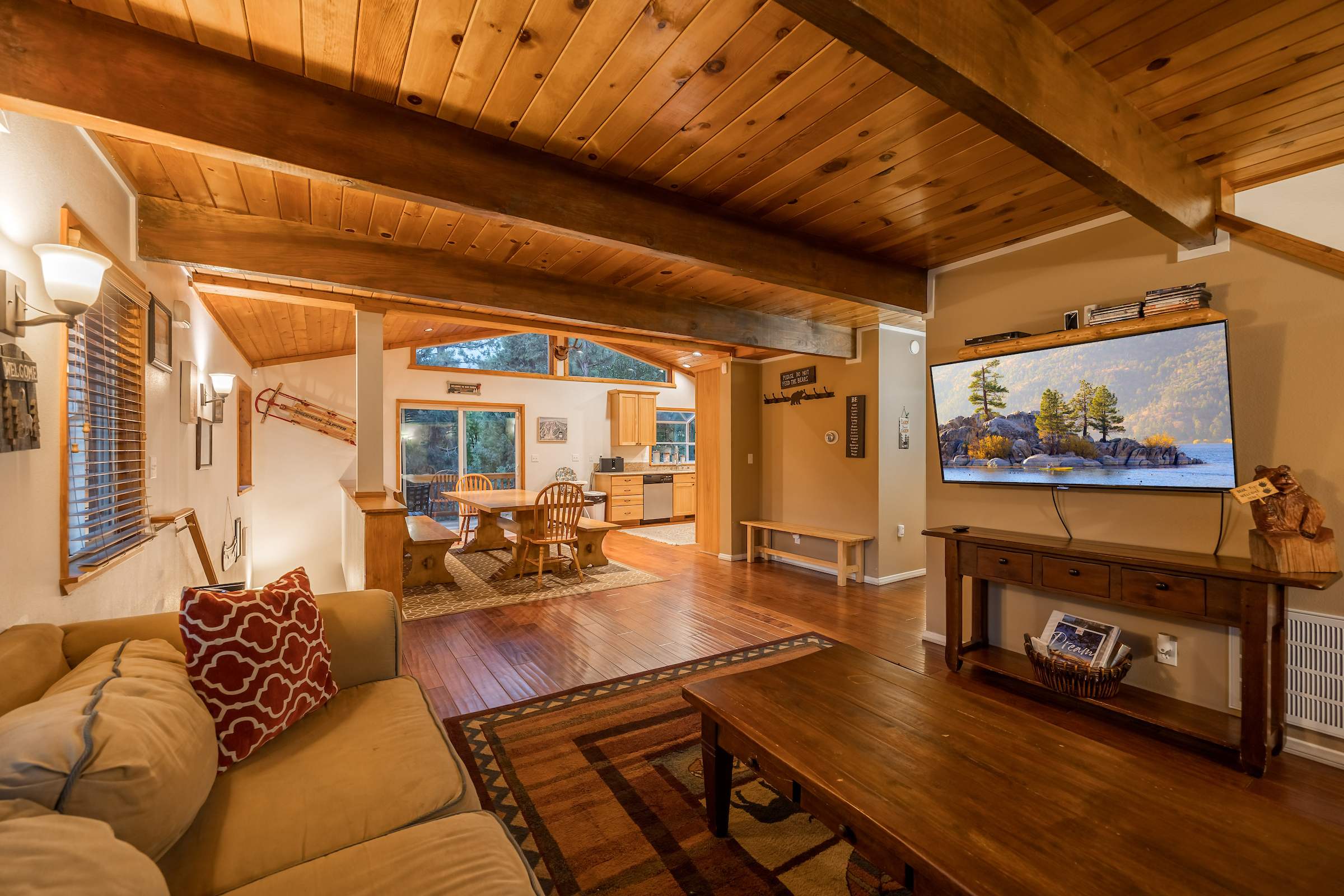 Cozy up at this spacious Big Bear retreat! 3 bedrooms, 3 baths, wood floors, a fireplace, full cook’s kitchen, game room, and fast Wi-Fi. Relax on the deck, soak in the hot tub, grill under the pines, and enjoy a fully fenced backyard. Steps to Meadow Park and the lake, and minutes to the Village, Snow Summit, and hiking—your ideal mountain escape!