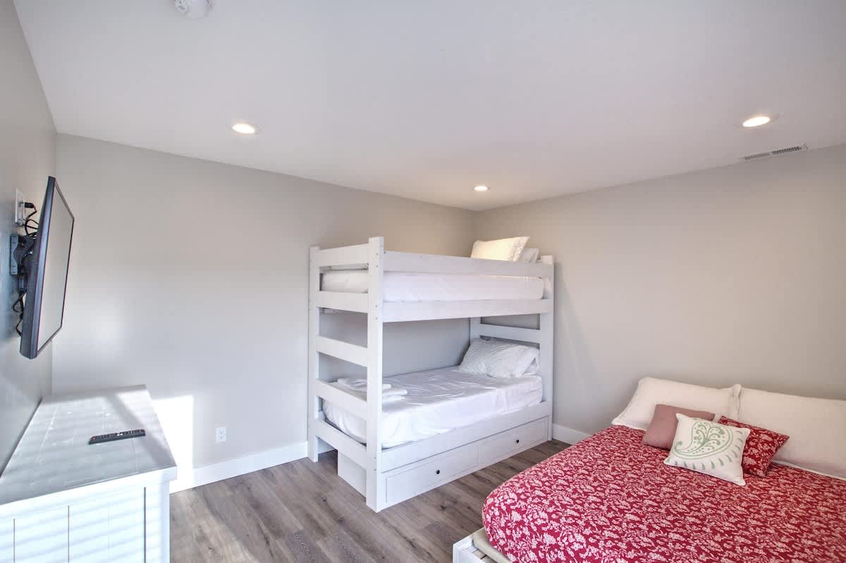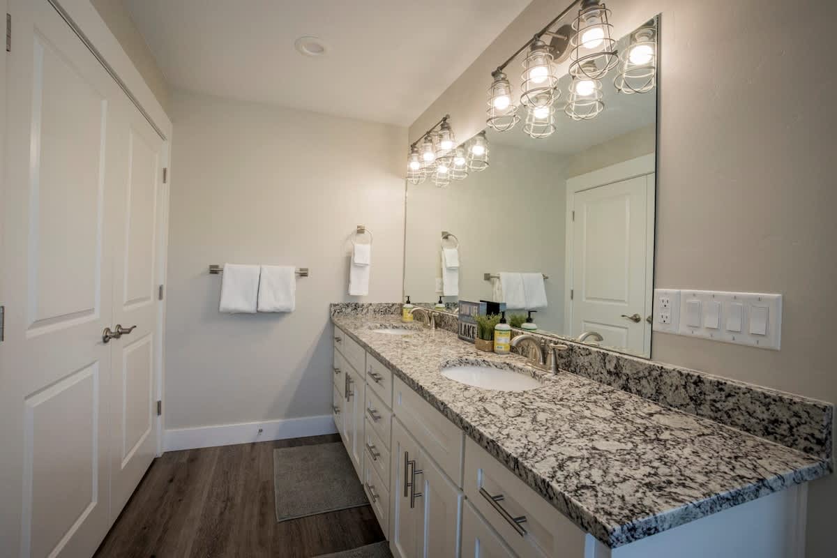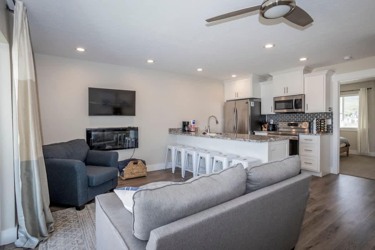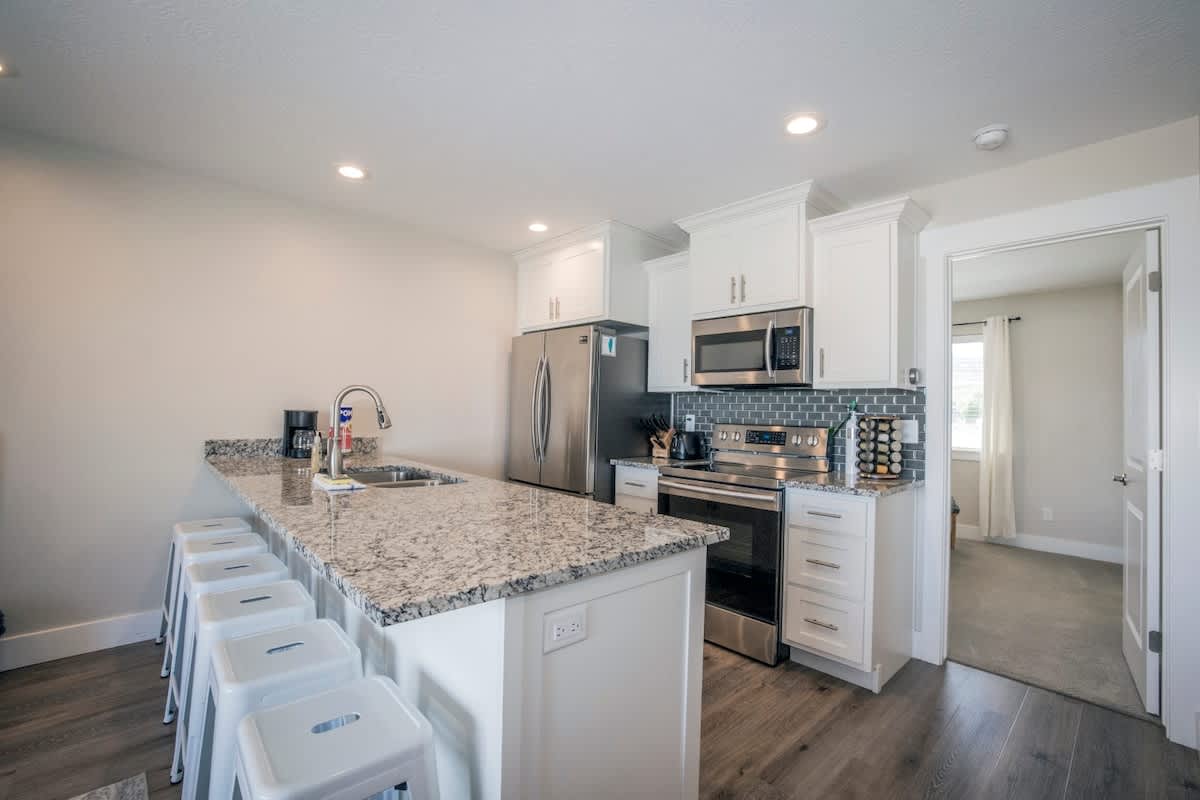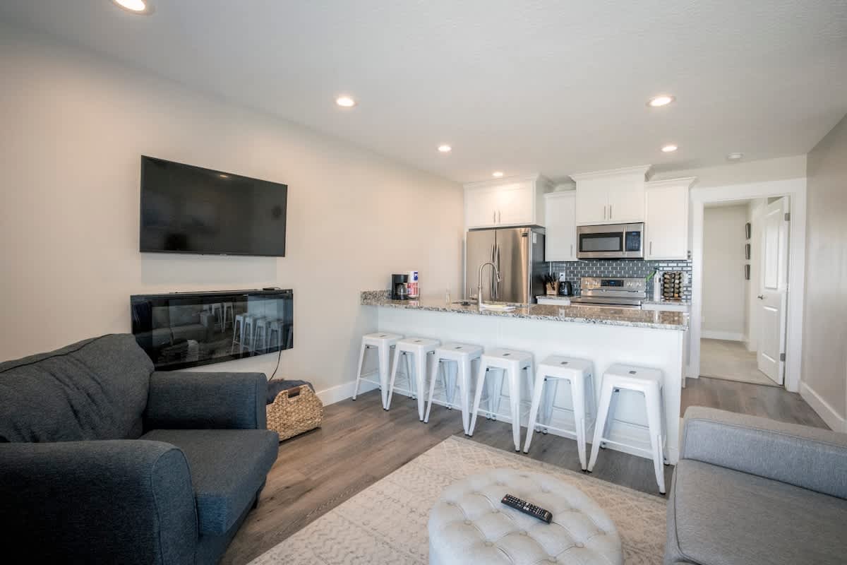Townhome Amenities and Features: Private gated community Access to clubhouse amenities, (seasonal) outdoor pool, (year-round) hot tub, and gym 4 Smart TV’s (Upstairs Living room and all 3 Bedrooms) WIFI Fully equipped kitchen (dishes, cookware, stove, microwave, fridge, dishwasher) Seating for 10 around the bar Washer and dryer BBQ grill Beds and linens for standard occupancy Towels provided for max occupancy (please bring own pool and beach towels) Modern theme Walking distance to town