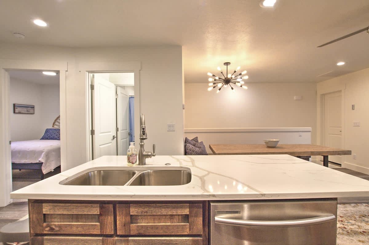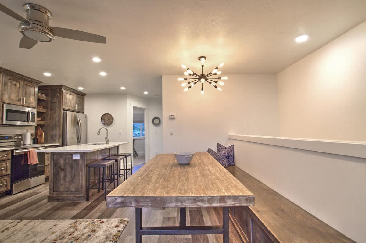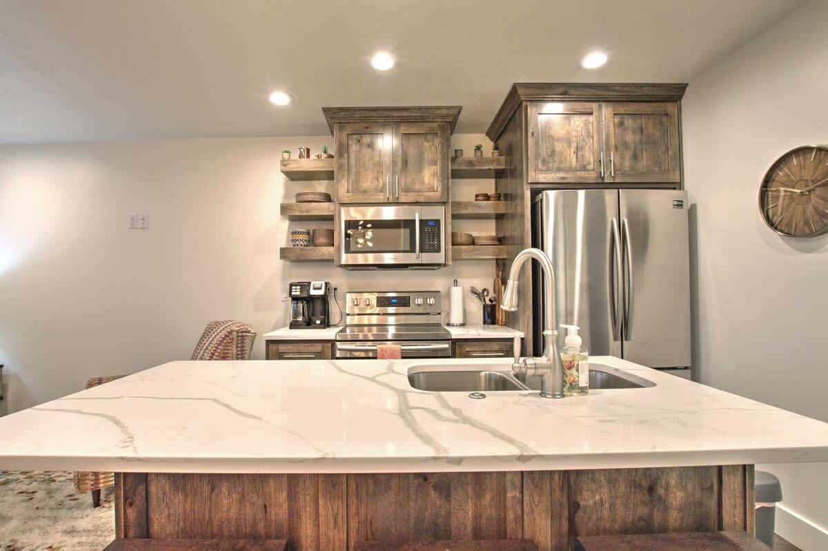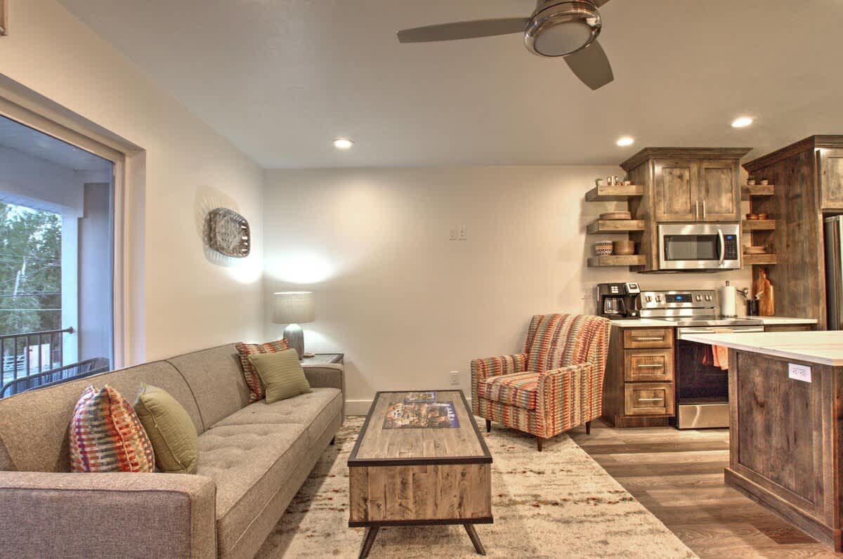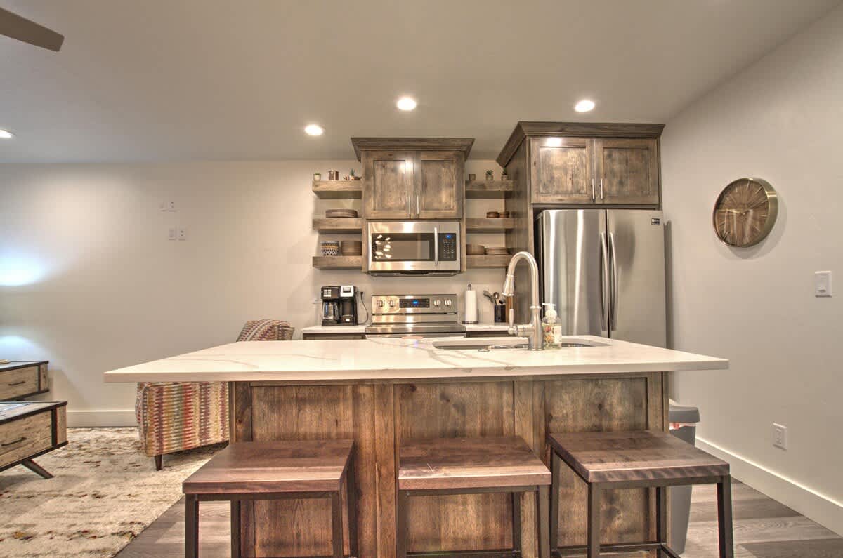 Lakeview Townhome #33 Sleeps 10 people (12 max) Parking for up to 3 vehicles 4 bedrooms, 2 bathrooms, 2 levels 1136 square feet ***Note – There are 24 stairs to climb from the main level entrance to the upstairs area where the kitchen and 2 bedrooms are located.