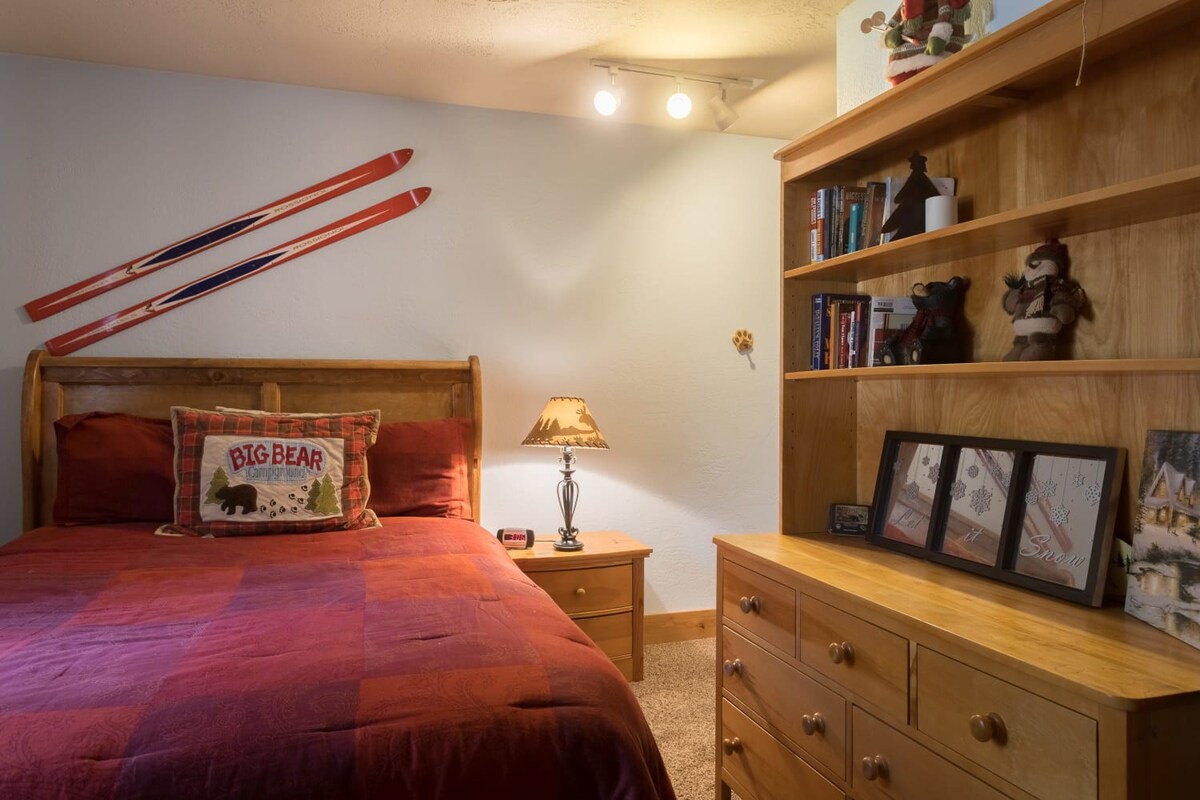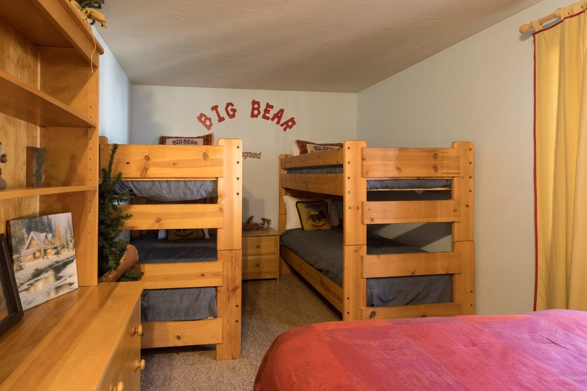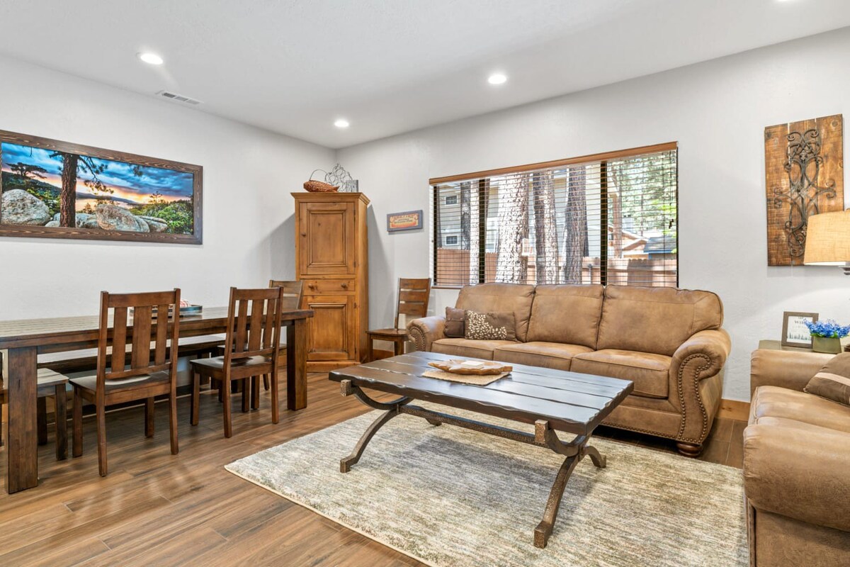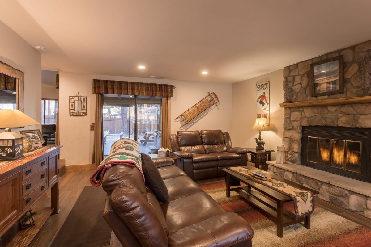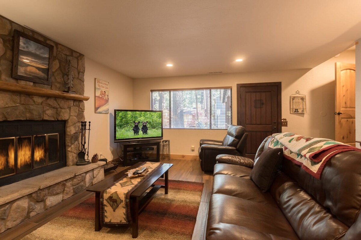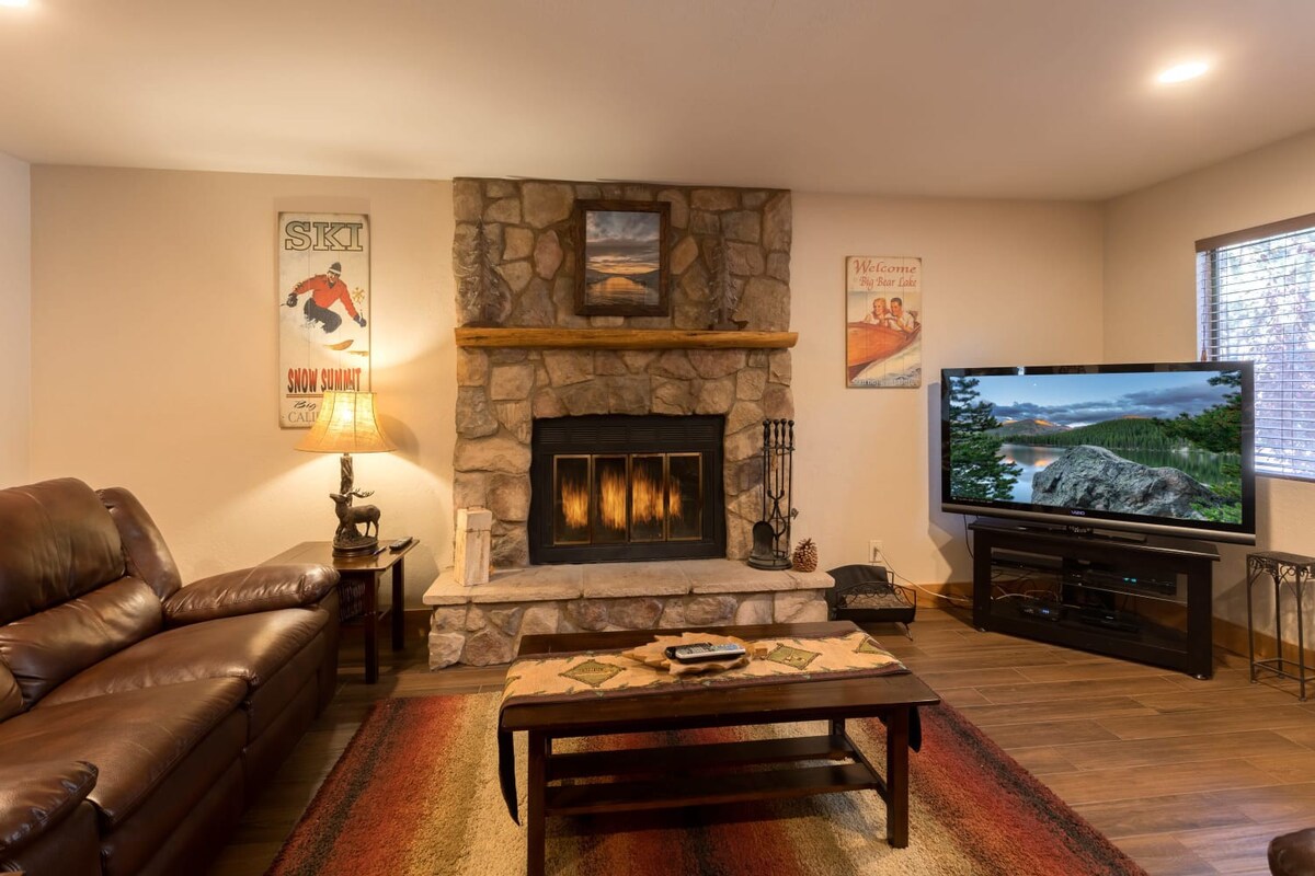 You're just steps away from Snow Summit, eliminating parking and transportation worries. With 3 spacious bedrooms containing a total of 6 beds and 3 beautiful bathrooms, this cabin is ideal for families or groups of friends. Cozy up by the wood-burning fireplace, or unwind in the private indoor spa after a day of activities. The fenced backyard with a BBQ is the perfect spot to enjoy the outdoors and savor delicious meals.