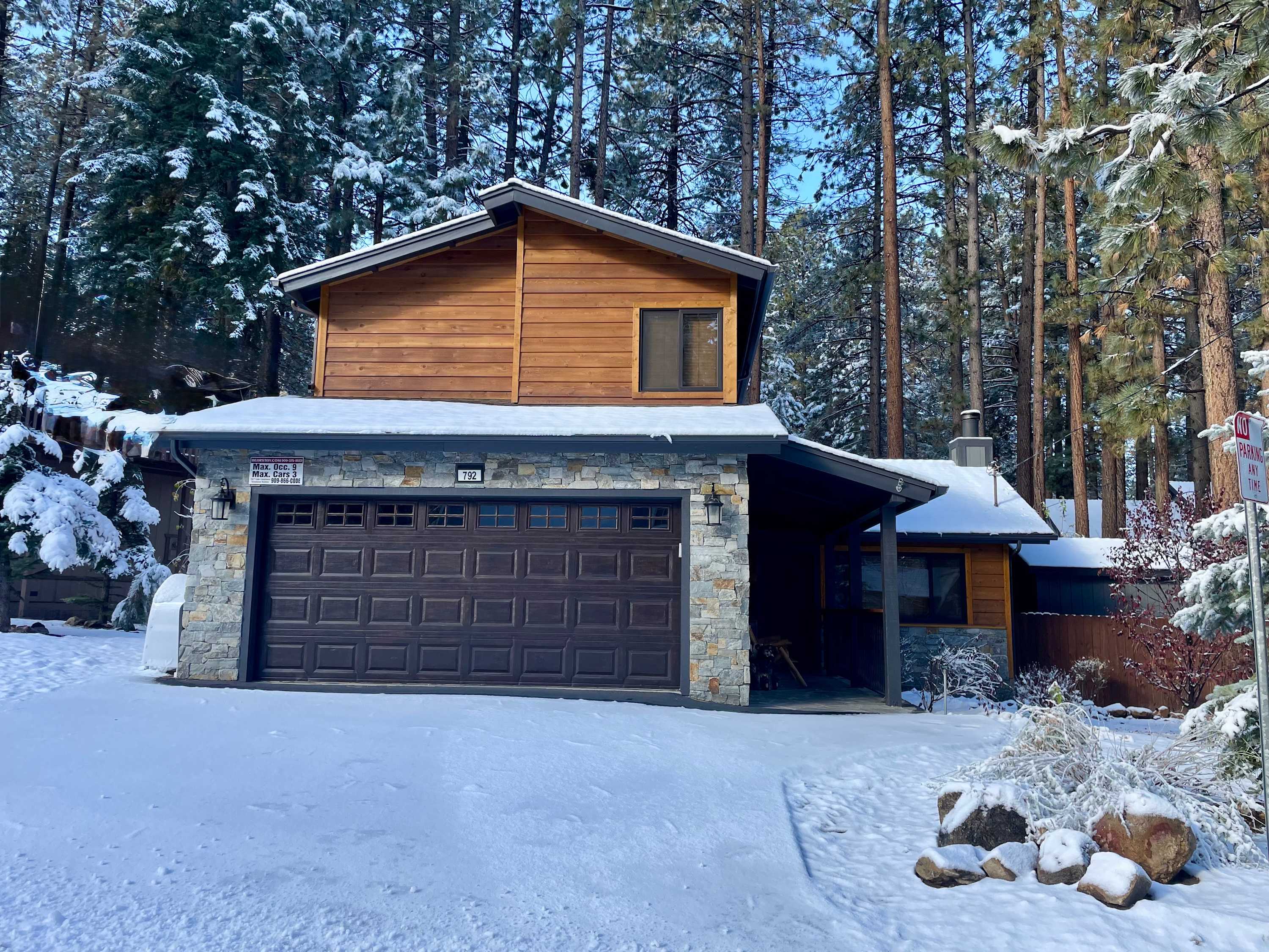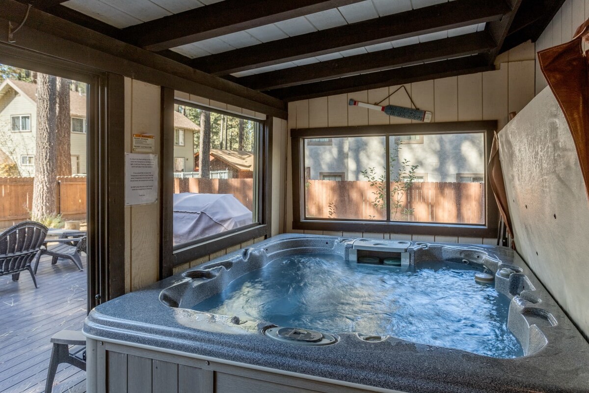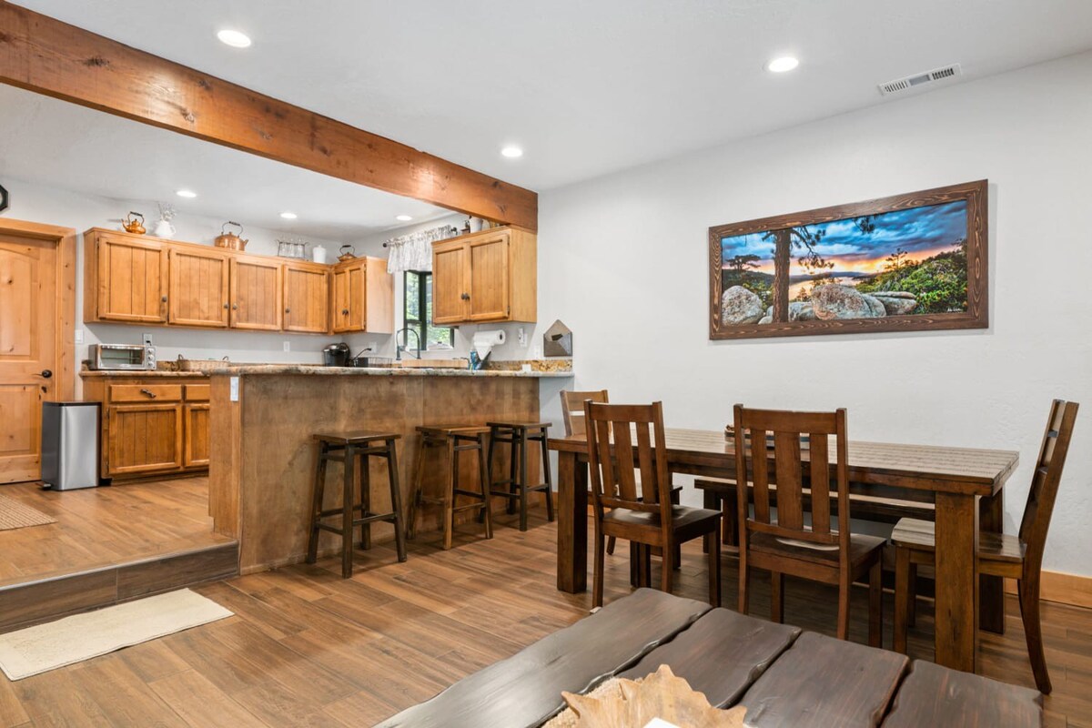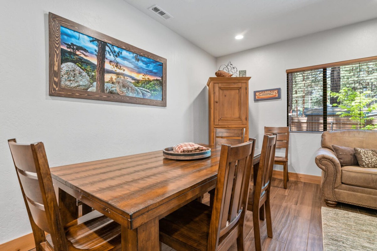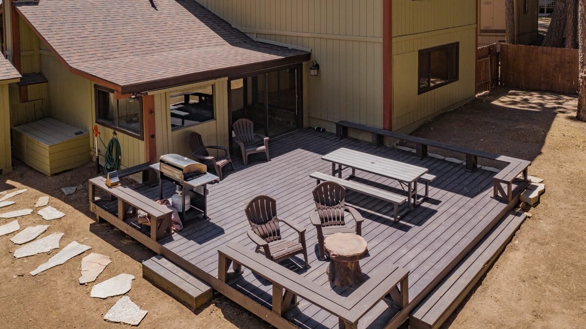 You're just steps away from Snow Summit, eliminating parking and transportation worries. With 3 spacious bedrooms containing a total of 6 beds and 3 beautiful bathrooms, this cabin is ideal for families or groups of friends. Cozy up by the wood-burning fireplace, or unwind in the private indoor spa after a day of activities. The fenced backyard with a BBQ is the perfect spot to enjoy the outdoors and savor delicious meals.